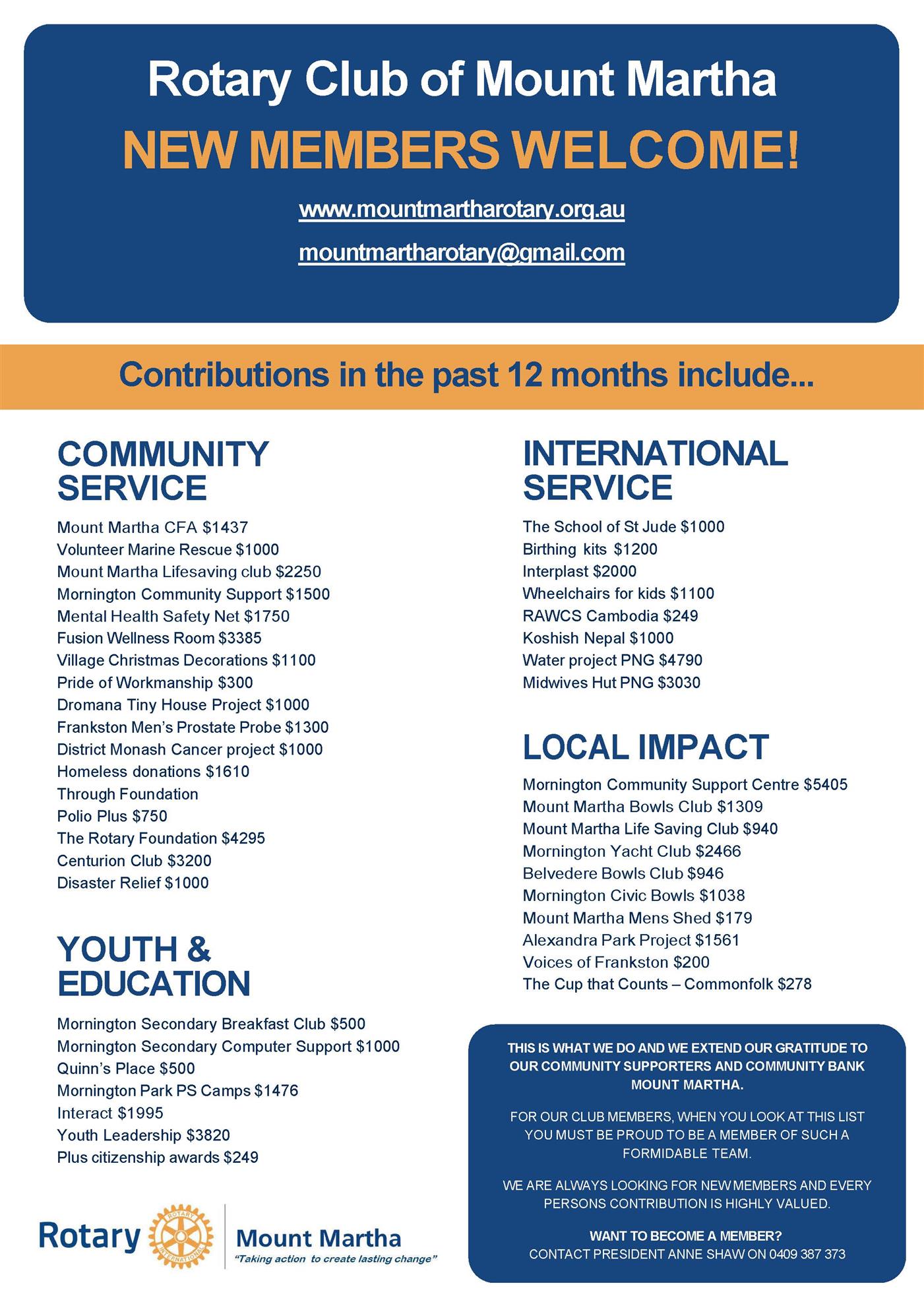 Of the $63,437 we have raised, $42,546 has been retained by the club - with $20,890 paid out to our partners, including $7,978 to the Mornington Community Support Centre. Remaining funds will continue to be distributed to Rotary Club projects.