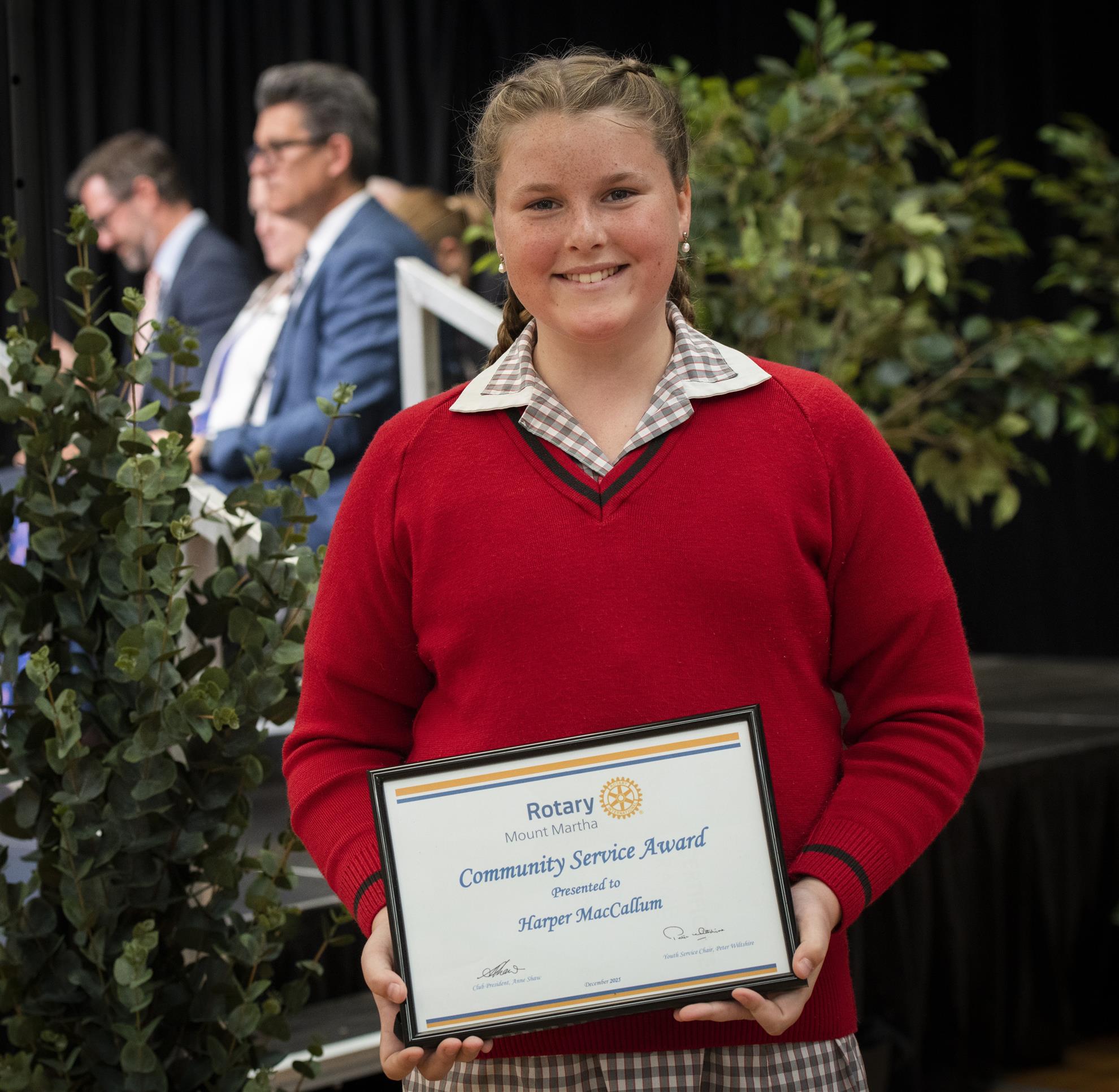 Harper demonstrates leadership through example and her dedication to living the Balcombe Grammar School values, making her an outstanding role model and deserving recipient of the 2025 Rotary Community Service Award.